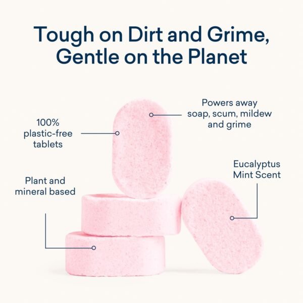 See ya. soap scum. Goodbye. harsh chemicals. Tackling the dirtiest space in the house just got cleaner. Our 100% plastic-free tablets are safer for your family. healthier for the planet. and proven tot get surfaces sparkling clean. Just fill your bottle with water. drop in a tablet and voila—you’re ready to clean from tub to tile.
